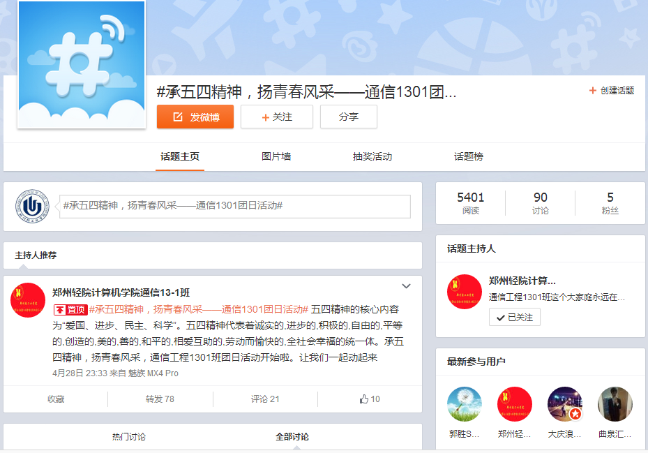 本次示范团日活动由我院获得校2014-2015学年十佳红旗团支部的通信工程13-1班团支部举办。中午12点,通信工程13-1班团支部全体成员和学院各团支部代表齐聚简洁而庄重的活动现场,由主持人宣布团日活动正式开始。首先,同学们起立,集体合唱共青团团歌—《光荣啊,中国共青团》。接着优秀团员于楠同学进行了极富激情的诗朗诵《为祖国而歌》,在深情的朗诵声中,同学们受到了触动,眼眶泛红,纷纷报以热烈的掌声。随后,活动进入到“五四”运动和“五四”青年节知识竞答环节,同学们争先恐后,踊跃抢答。最后,大家观看了“五四”运动的相关视频,重温了那一段光荣的历史。在活动现场,我们开展了微博话题互动抽奖活动,在场的同学们纷纷登录新浪微博并关注:郑州轻院计算机学院通信工程13-1班,参与话题#承五四精神,扬青春风采—通信工程13-01班主题示范团日活动#,转发该话题的置顶微博参与抽奖。