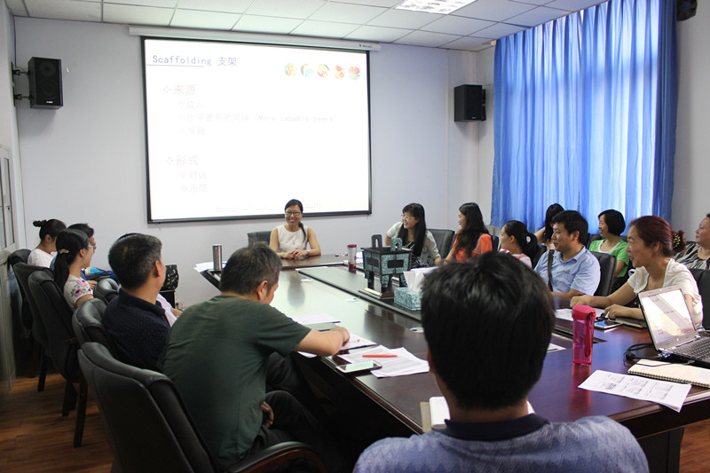 郭老师首先介绍了第二语言习得领域的两个理论,即社会文化理论和输入假设,就其中的最近发展区、支架和“i+1”等核心概念,结合教学实践,做了深入浅出的介绍。然后,郭老师又结合英语教学,将这两个理论中的基本观点进行总结、整合,用于教学指导。在报告中,郭老师分享了其在这些理论指导下,反思教学环节,对教学活动设计的一些改革设想。这些想法也激发了在座英语老师对教学的思考,现场展开了热烈的讨论。