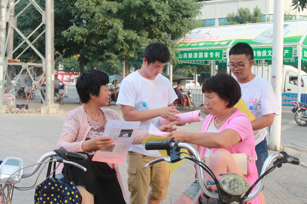 7月11日,在院分团委书记张宏英老师的带领下,法律义务宣传三人小分队来到沁阳市开展普法进万家暑期实践活动,利用法律知识宣传页和调查问卷在沁阳市城区怀庆路上对沿途居民进行随机调查,并向居民进行法律义务援助的宣传,引导群众通过合法途径维护自己合法权益。