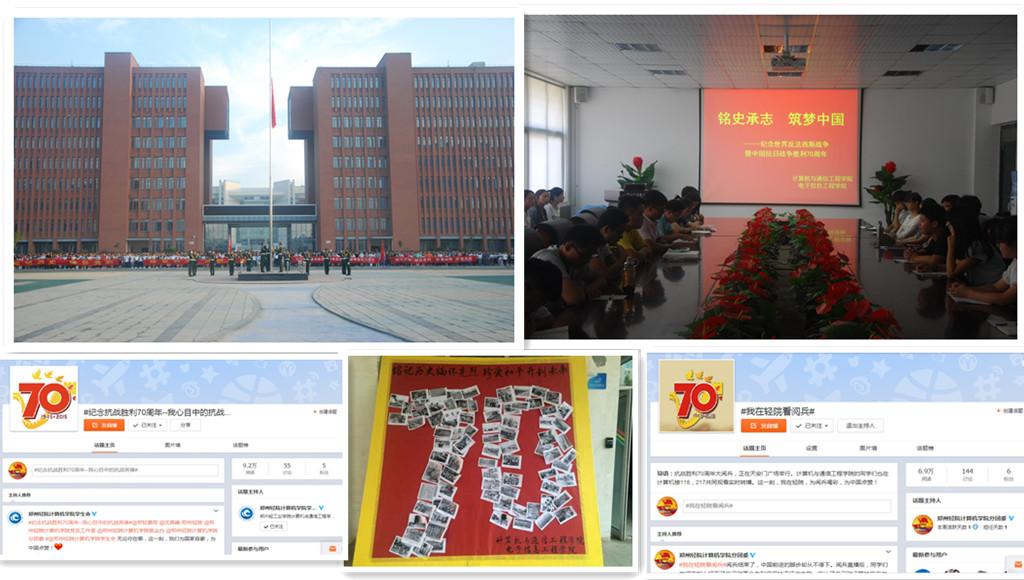 除此之外,学院在线上微博阵地开展网上纪念传递活动。学院组织#纪念抗战胜利七十周年——我心目中的抗战英雄#、#我在轻院看阅兵#等微博话题活动,引导学生进行积极进行线上互动,各学生组织、班级团支部、广大学生纷纷通过微博、微信发表感受,表达自己铭记历史,缅怀先烈、珍爱和平的爱国情怀。