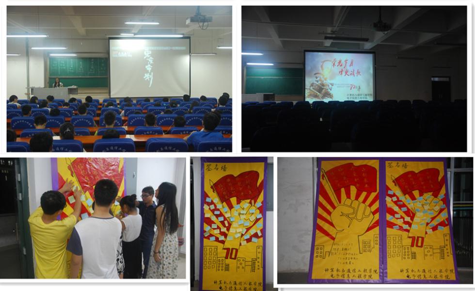9月1日—9月3日,学院组织进行了“纪念中国人民抗日战争暨世界反法西斯战争胜利70周年”主题爱国主义电影展播。学院连续三天晚上在计算机楼217组织学生观看了《太行山上》、《东京审判》、《夜袭》等抗战爱国电影,观影结束后,同学们纷纷在现场设置的“铭志签名墙”留言,表达自己铭记英雄、珍惜和平的爱国情怀。