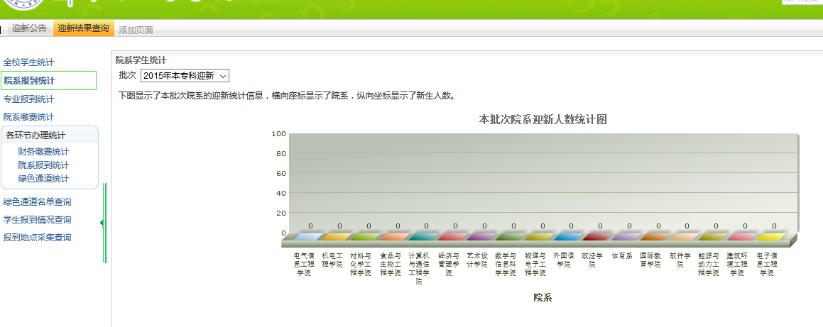 2、若需要详细了解院系报到情况,点击左侧“院系报到统计、专业报到统计、院系缴费统计、各环节办理统计、各专业学生统计”菜单,根据需要查看不同类别的统计。如图所示为院系报到统计图: