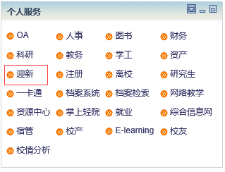 由学校主页“信息门户”或在IE地址栏输入http://my.zzuli.edu.cn/进入信息门户登陆页面,使用信息门户用户名、密码登陆系统后,点击个人服务中的【迎新】系统,如下图所示: