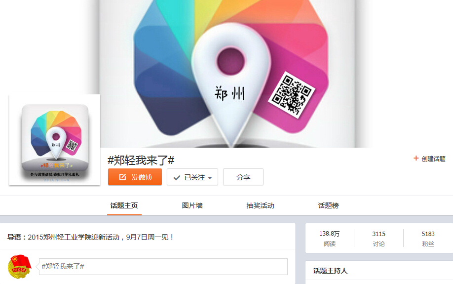 (四)志愿者组成宣传小分队,以微博、微信等形式与新生进行亲密互动,给新生入学提供及时有效的帮助,加大我校迎新工作及团学工作的宣传,吸引广大新生关注我校建设发展成就及学校有关工作。我校迎新微博话题“郑轻我来了”上线后,在新浪微博热门话题排行榜居全国32名,阅读量高达138万,参与讨论量3100多条。