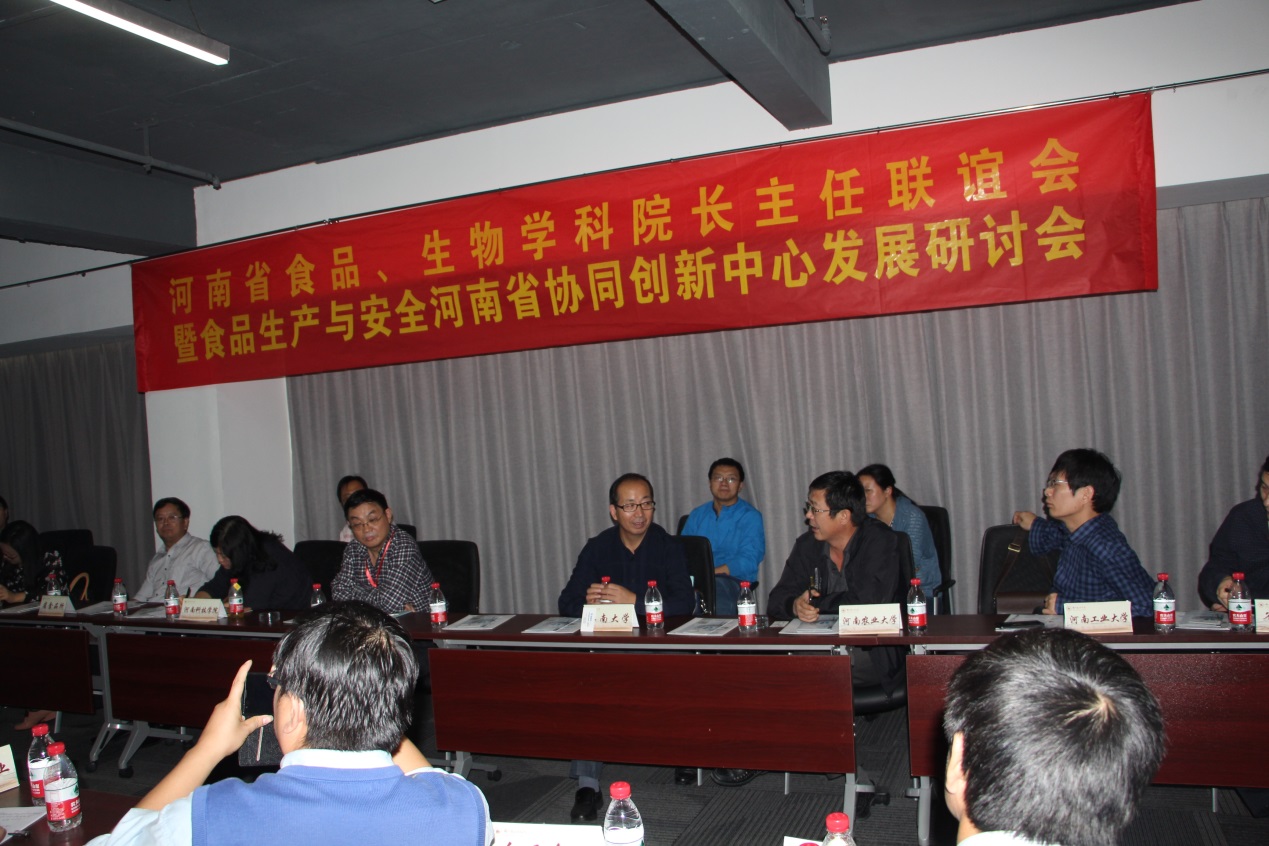 2015年10月17日上午,河南省食品、生物学科院长主任联谊会暨食品生产与安全河南省协同创新中心发展研讨会在我校举行。此次会议由我校食品与生物工程学院、食品生产与安全河南省协同创新中心主办。参会单位主要有国内和省内主要从事食品行业教学和科研的高校和研究所(江南大学、河南工业大学、河南农业大学、河南科技大学、河南省食品工业科学研究所等)、以及我省食品行业的龙头企业(三全食品股份有限公司、河南大用实业有限公司、河南众品食业股份有限公司、好想你枣业股份有限公司等)。