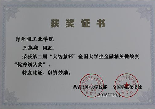 日前,由共青团中央学校部、全国学联秘书处主办、上海大智慧股份有限公司承办的第二届“大智慧杯”全国大学生金融精英挑战赛圆满落下帷幕。我校学生获得全国高校金融操盘手一等奖2名,二等奖9名,三等奖81名,校团委王燕翔、经济与管理学院陈章美荣获“优秀领队奖”,学校荣获“优秀组织奖”。