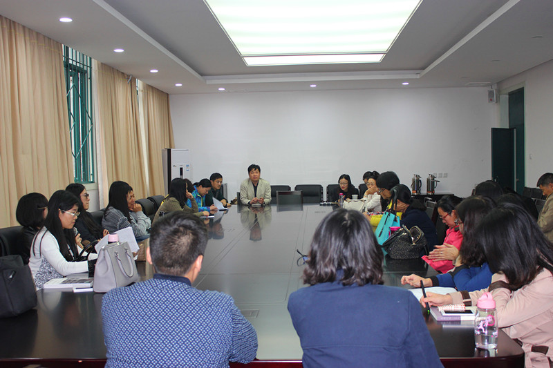 1022日下午,外国语学院在东二楼109会议室召开了2015-2016学年第一学期教师代表座谈会。会议由外国语学院教学院长周麦成主持,教务处教学科刘璐老师、外国语学院各教研室主任及教师代表共30多人参加了座谈。