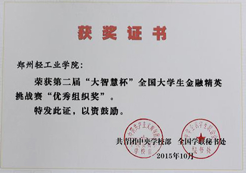 日前,由共青团中央学校部、全国学联秘书处主办、上海大智慧股份有限公司承办的第二届“大智慧杯”全国大学生金融精英挑战赛圆满落下帷幕。我校学生获得全国高校金融操盘手一等奖2名,二等奖9名,三等奖81名,校团委王燕翔、经济与管理学院陈章美荣获“优秀领队奖”,学校荣获“优秀组织奖”。