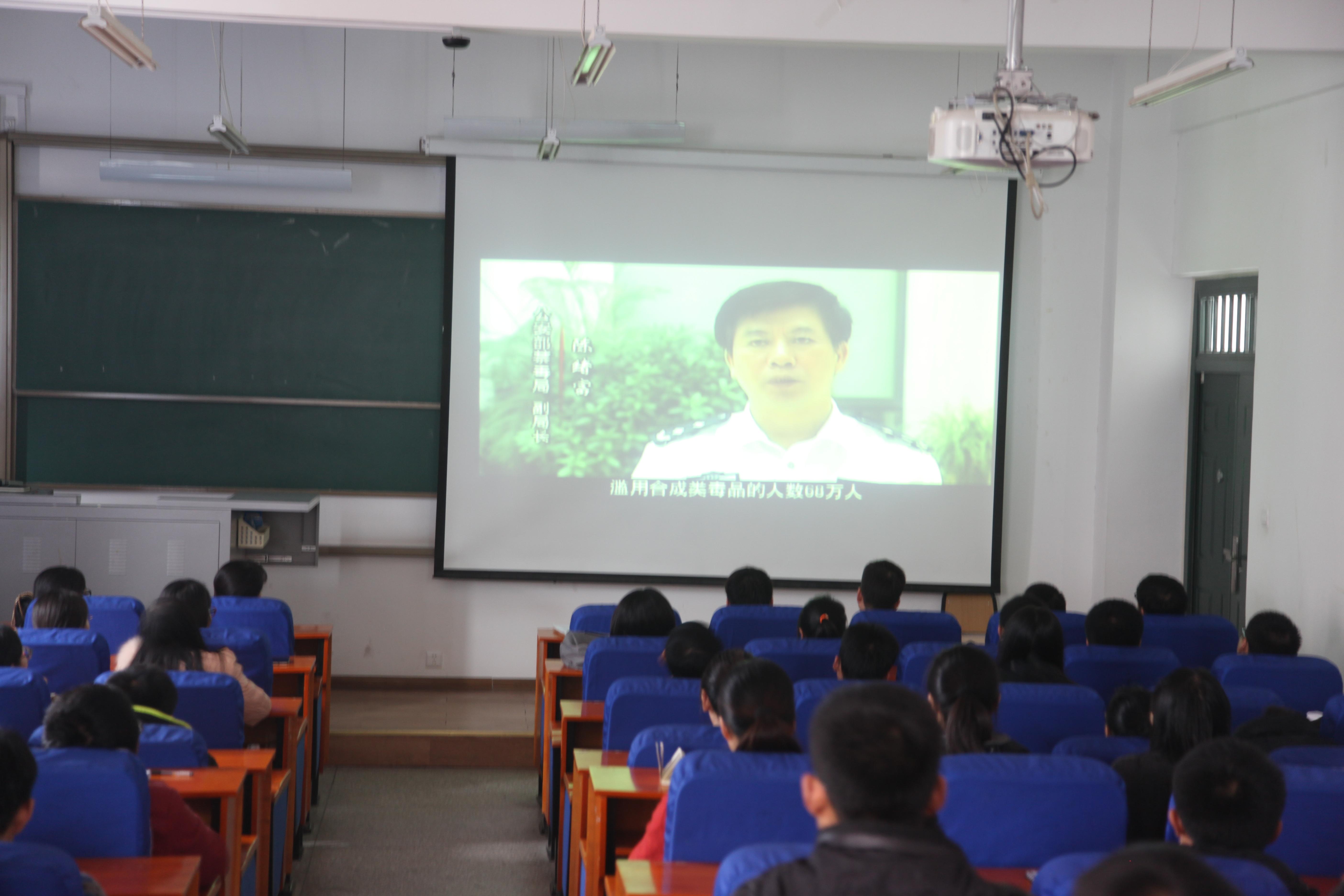本次活动共分为四个环节,吴占超书记首先传达了中共中央领导同志对禁绝毒品的指导精神,结合实例分析了禁毒宣传的急迫性和广大党员干部知毒、禁毒、防毒的必要性,号召广大党员要严于律己,发挥好表率作用,构筑思想防线,远离毒品,并做好禁毒工作的宣传员。学工办主任尚金清老师通过多媒体演示形象生动地向师生介绍毒品的种类、目前毒品滥用的现状、国家有关禁毒的法律法规;并以具体实例说明毒品不仅毁灭自己、祸及家庭,更大的对社会造成危害性后果。动员广大师生要时刻告诫自己“一日吸毒,终身戒毒”。要有坚定的意志、扎实的工作做好禁毒工作。并要从自身抓起,做好广大师生禁毒的教育和防范,让师生积极追求健康文明的生活方式。