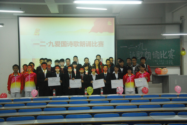 本次活动,各班级分别进行初赛,最终每班推荐一支队伍参加决赛。比赛中,来自17个班级的参赛选手们动情的演绎着一首首饱含爱国情思的诗篇,《青春中国》对祖国沉痛历史的回想和对辉煌未来的展望表达了同学们的热血情怀;《祖国啊,我亲爱的祖国》饱含深情,掷地有声,表达了青年学生对祖国母亲的真挚热爱;《悠悠中华情》表达着对祖国的无限热爱与赞美,祝愿我们的祖国更加美好……一篇篇情真意切的爱国诗歌、一个个真情流露的精彩表演,演绎了爱国情,表达了爱国心,引起现场评委和同学们的强烈共鸣,不时赢得阵阵掌声。最终经过一个多小时的角逐,经评委公平公正打分,通信工程15-1班爱国青年队朗诵的《少年情》和软件工程15-1班晨曦队朗诵的《我爱你,中国》获得本次大赛的一等奖。