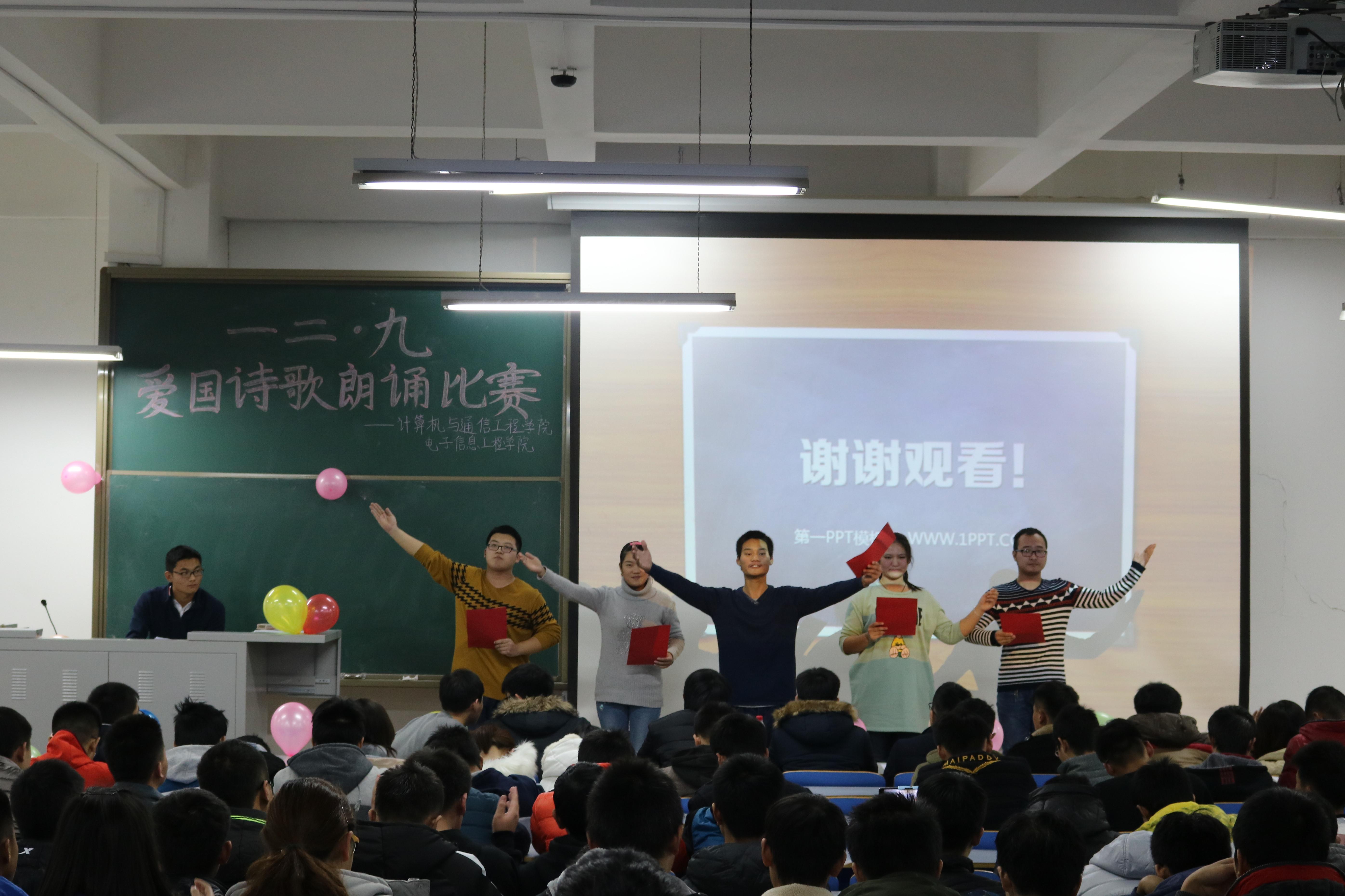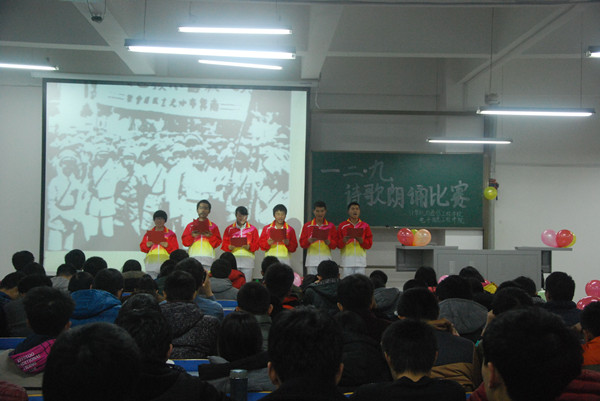 为纪念“一二·九”运动80周年,激发广大学生的爱国热情,11月29日晚19:00计算机与通信工程学院(电子信息工程学院)在计算机楼118和503举办了“一二·九爱国诗歌朗诵比赛”,学院2015级全体新生参加了此次活动。