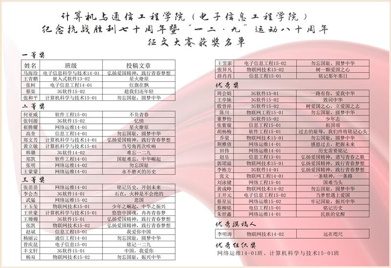 为纪念抗日战争胜利70周年暨“一二.九”运动80周年,计算机与通信工程学院(电子信息工程学院)于11月15日-11月30日面向全院师生中开展系列活动征文大赛。