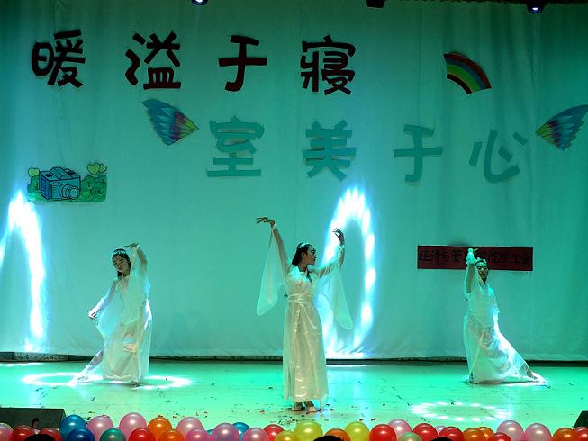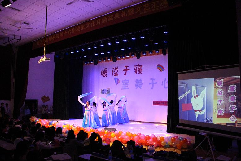 晚会在动感十足的韩舞《Shorthair》中拉开帷幕。优雅的舞姿、深情的朗诵、幽默诙谐的小品、感人至深的哑剧,都流露出了同学们对寝室这个温馨的家的无比热爱。在晚会现场,我们对寝室精心装扮、卫生整洁、文化氛围浓厚的优秀宿舍进行了表彰。诗朗诵《青春•律动》激发了同学们对青春的歌颂、梦想的追求以及对未来的憧憬,更进一步烘托了演出的氛围,让现场观众沐浴在一片温馨之中;优雅的古典舞《三寸天堂》、《星月神话》表现了中国舞蹈文化的博大精深;形式新颖的哑剧《如果爱》表现了动物之间真挚的爱情;深情的对唱《爱我别走》把晚会推向高潮。整场晚会伴随着充满活力的舞蹈表演落下帷幕。