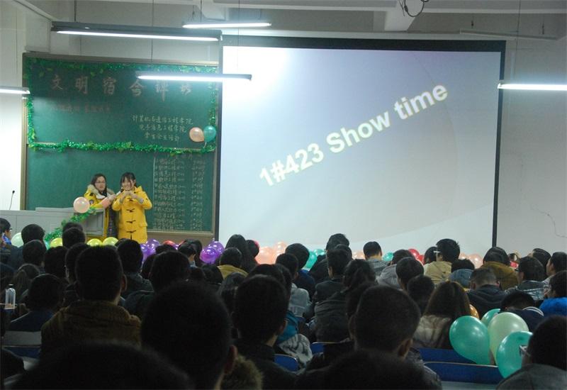 晚7:00,“文明宿舍”评比大赛正式开始。本次大赛分为宿舍卫生评比、宿舍文化PPT展示、寝室成员才艺展示三个环节。首先,主持人详细介绍本次大赛活动流程,并公布了参赛宿舍卫生检查情况整合汇总成绩,接着,各个宿舍代表以PPT或视频等形式向观众展示了自己宿舍的特色风采和精神面貌,或清新婉约,或激情四射,或阳光欢快,或别具一格,无不展示出了我院学生多才多艺、青春阳光的一面。除此之外,才艺展示环节,选手们纷纷以动听的歌曲、酷炫的舞蹈、神奇的魔术展现了宿舍文化的多样化,博得现场掌声阵阵,得到在场的观众一致好评,气氛热烈。