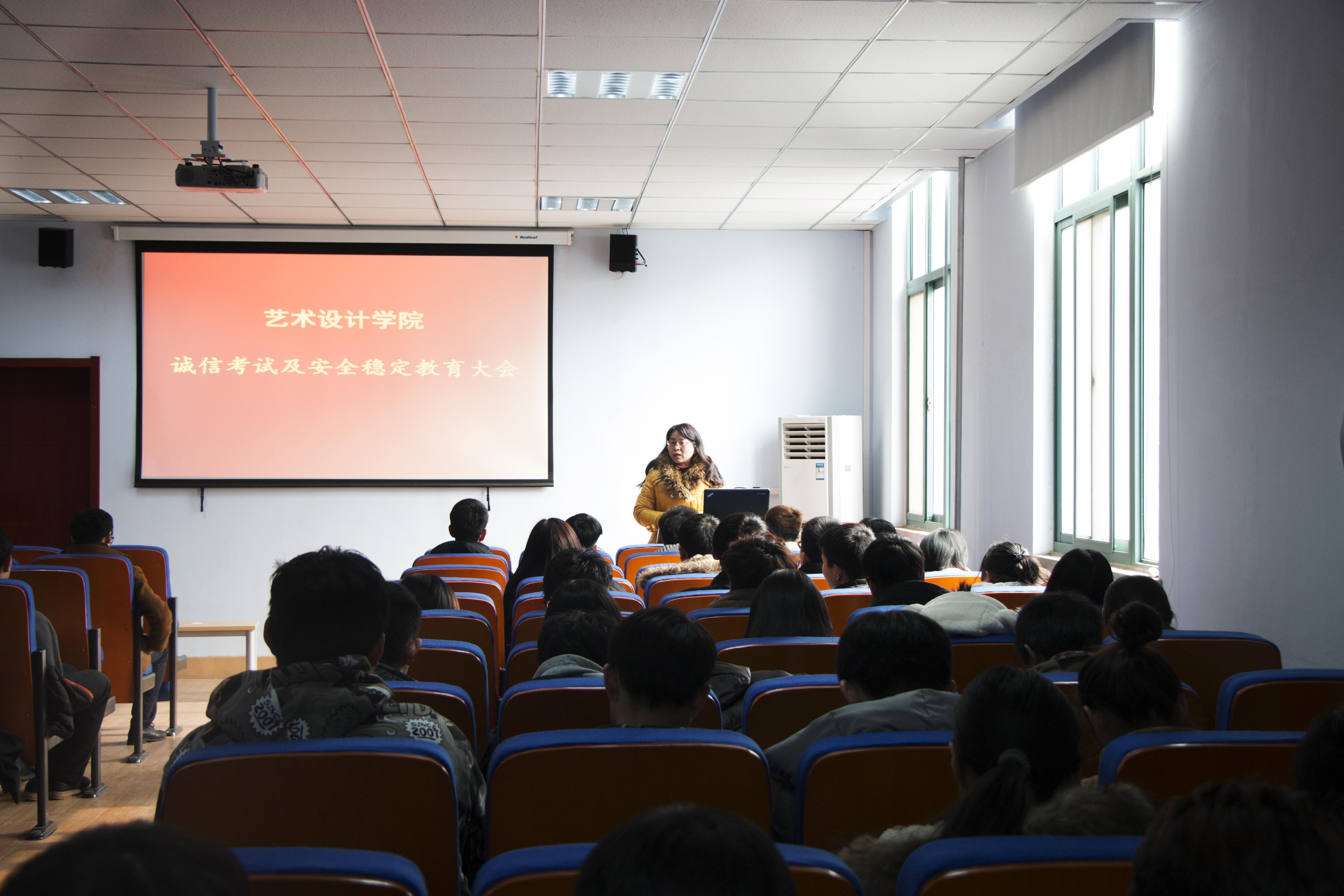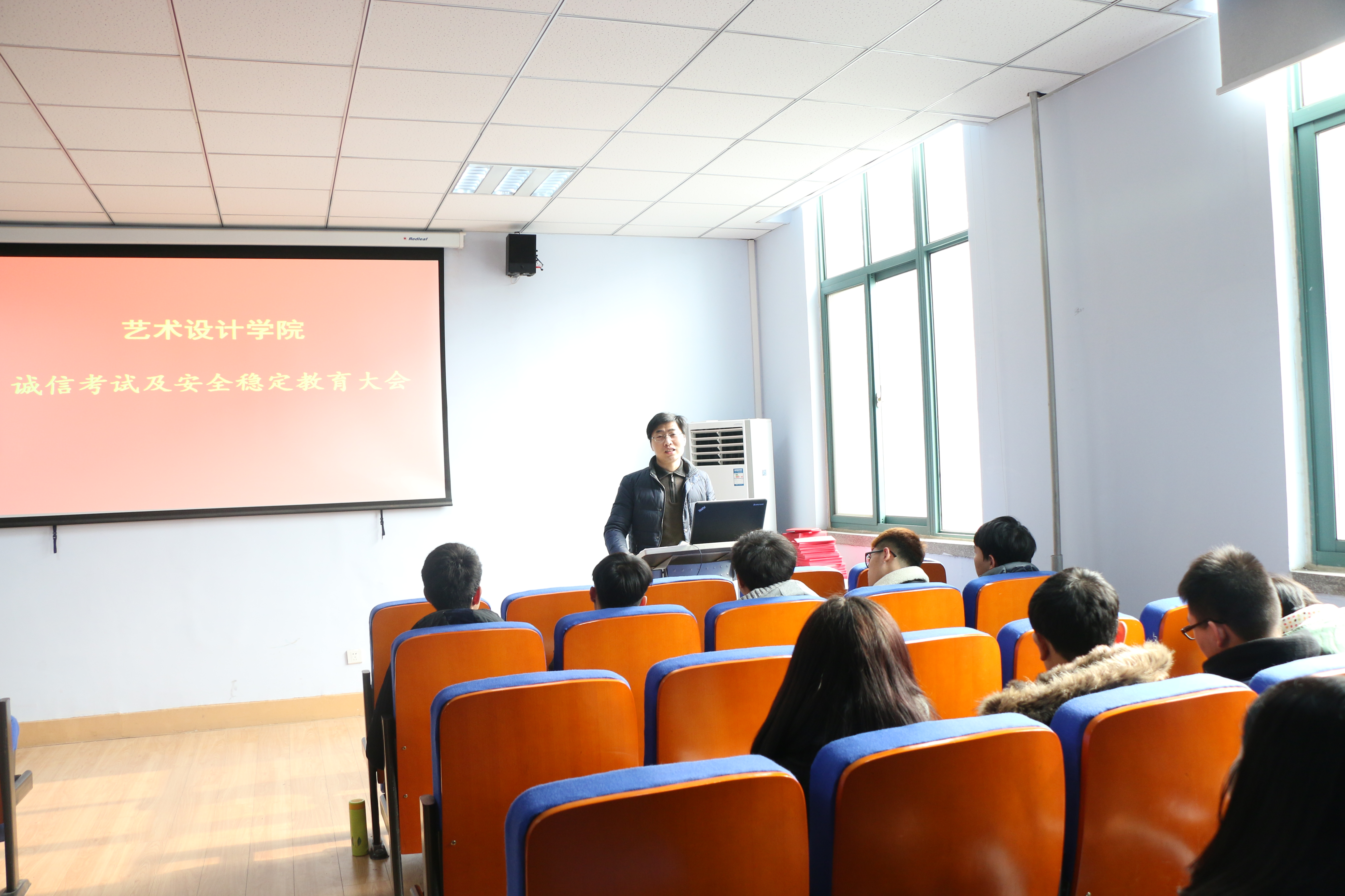 2016年1月11日和12日,艺术设计学院在东四楼301举行诚信教育及安全稳定教育大会。学院党总支副书记张莉老师、专职辅导员贾红雨老师、孙丰老师以及2014级和2015级所有学生干部约200人参加了大会。
