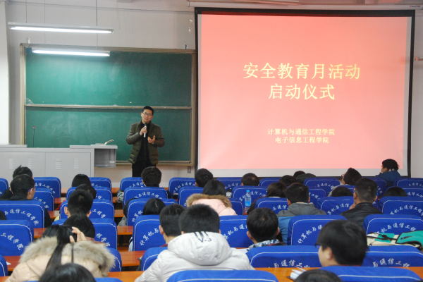 为提高同学们的安全防范意识,建设和谐稳定校园,计算机与通信工程学院(电子信息工程学院) 3月9日中午在计算机楼217举行安全教育月启动仪式,分团委书记沈高峰老师、辅导员孟牒老师及250名学生干部代表参与此次会议。