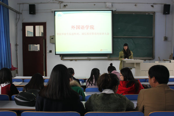 3月17日下午,外国语学院在东二楼100教室召开2016届贷款毕业生诚信教育大会,学院党总支副书记孔祥娟、负责贷款老师的矫菲老师及2016届全体贷款毕业生参加会议。
