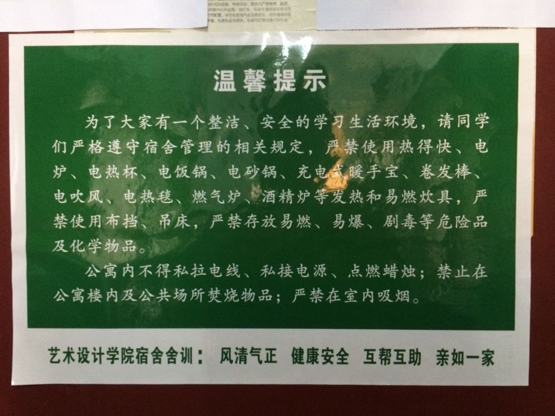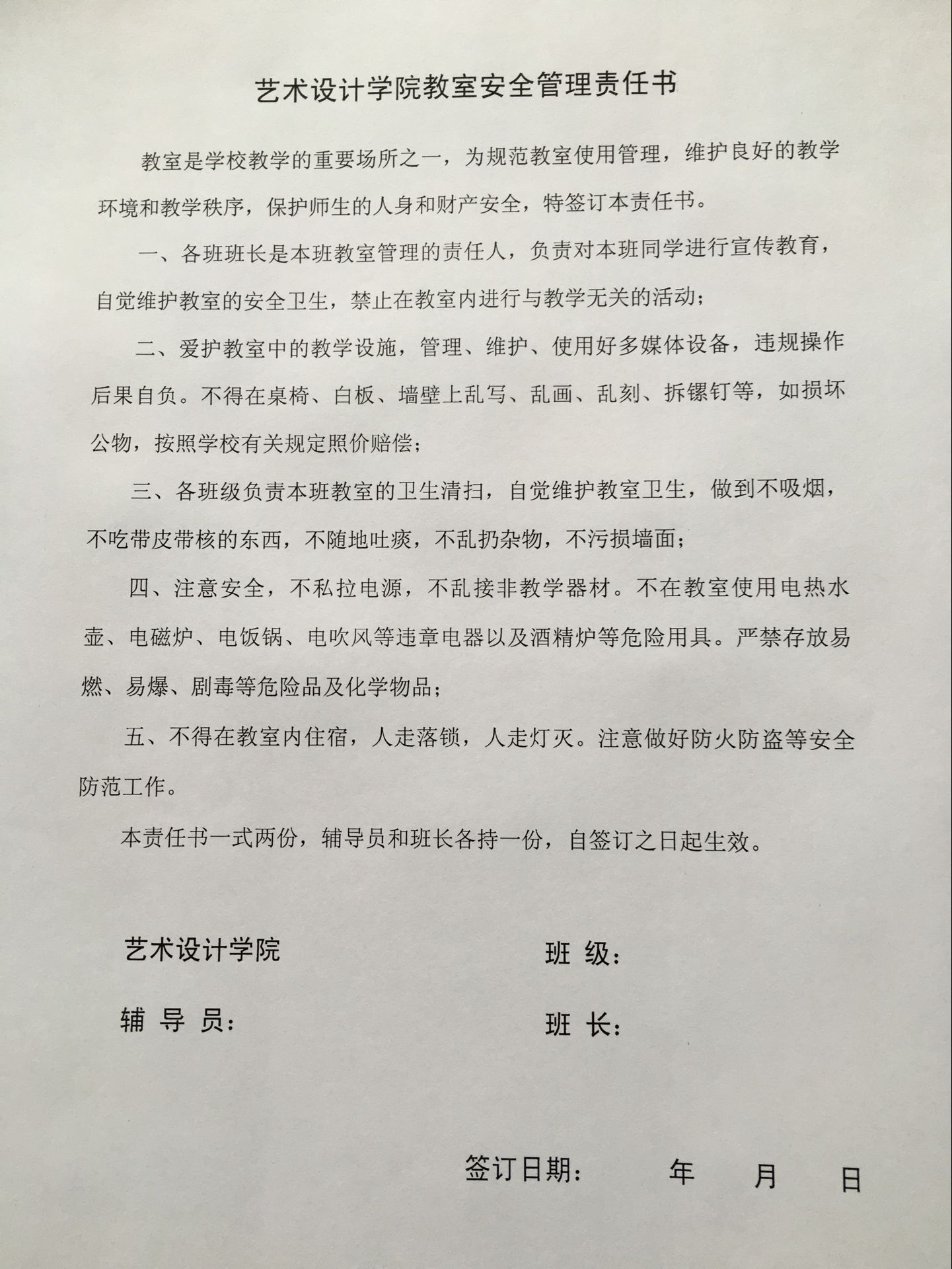 教室和宿舍是学生日常学习生活的主要场所,为保障学生学习生活环境的安全、文明、卫生,学院在79个专业教室张贴《艺术设计学院教室安全管理规定》及教室安全《温馨提示》,在320多个宿舍张贴宿舍安全《温馨提示》,制定了艺术设计学院班训和舍训,与各班班长签订了《教室管理责任书》;为取得学生家长对学校安全教育的支持和配合,共同做好安全教育工作,学院每学年与学生及学生家长签订一次《安全告知书》,学院、学生、学生家长各留存一份,强化安全第一,预防为主的安全防范意识,携手共建和谐校园。