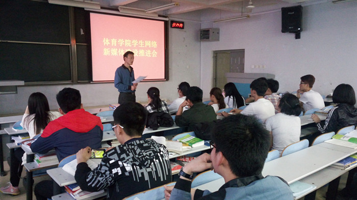 为促进校园网络文化建设,在学生中普及网络新媒体知识,4月1日下午体育学院在教三楼801召开了“体育学院学生网络新媒体建设推进会”,体育学院分团委书记石庆福、体育学院网络促进会全体成员参加了此次会议。