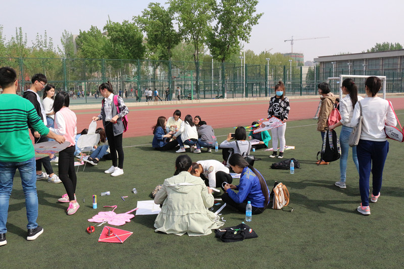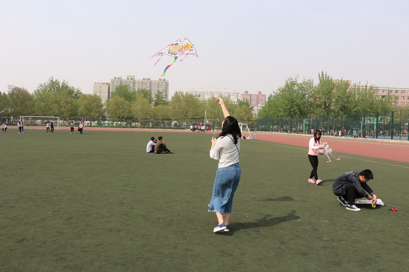 本次活动分为:风筝制作、风筝竞飞两个环节。活动伊始,同学们利用手中的工具和材料手工制作五颜六色、形式各异的风筝,有卡通人物、蝴蝶、太极图案和金鱼等。同学们或用英语,或用韩语,或用汉语,在风筝上写下自己的新年期许,表达对春天和生活的热爱。在放飞环节,一只只形态各异、五彩缤纷的风筝承载着同学们对生活的希望、祝福在蔚蓝色的天空中飞翔。在清风的吹拂下,它们把天空点缀得更加美丽。蓝天下是欢跑着的同学们,那一声声呼喊、一张张笑脸,表达了她们对大自然的热爱,同时也展现了他们的青春活力。
