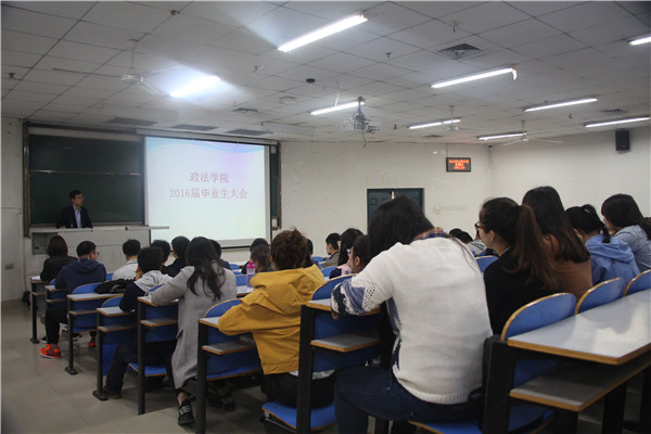 4月7日上午10点,政法学院在科学校区三教楼108召开了2016届毕业生大会。学院党总支副书记金亮老师、负责就业工作的刘栩静老师以及2016届毕业生参加了大会。