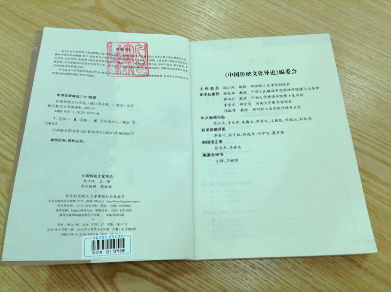 《中国传统文化导论》(中韩双语版)2012年出版,精准论述了中国传统文化的内核及基本形态,中文部分由汉语国际教育系陈江风教授、杜红亮教授著述,韩语部分由朝鲜语系李爱子老师、张炎钰博士、徐迎迎博士、夏月亮博士译著,在学界影响较大。该书现存韩国首尔大学中央图书馆“习近平捐赠图书资料室”,收藏编号:XIJINPING390.0952C4283j2013,2015年开放。