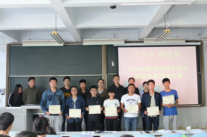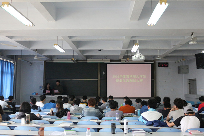 为推动我院学风建设,激发广大同学的成才愿望,帮助同学们合理规划大学生活,体育学院于2016年4月28日中午一点在教三楼801举办“正学风聚能量”职业生涯规划大赛。体育学院分团委书记石庆福老师、学工部主任李羚玮老师以及各年级学生代表担任此次大赛的评委,体育学院14、15级全体学生观看了比赛。