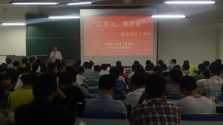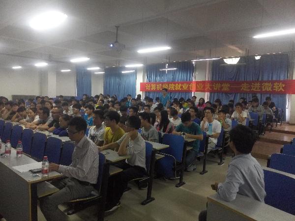 5月7日下午14:00,计算机与通信工程学院(电子信息工程学院)“正学风 聚能量”大学生就业创业大讲堂—走进微软活动在学院楼118室成功举办。微软(中国)有限公司-中国工程院资深项目经理陆敏和王英飚作了“创新—成功的引擎”为题的精彩报告,详细介绍了微软在管理、文化、产品研发中创新点;介绍了互联网行业的发展趋势,对人才的需求以及微软的企业文化,包括它的环境、特色、团队精神、人才观、管理风格等。学院分团委书记沈高峰、学工办主任司丽娜、分团委负责就业的欧阳杜娟及辅导员、学生干部代表、各年级学生代表300余人参加了报告会,报告会由沈高峰老师主持。