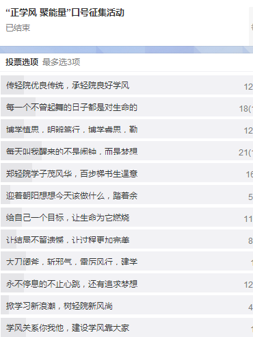 本次口号征集活动历经近半个月,分为宣传策划阶段、口号征集阶段、评选阶段三个环节。前期学院广泛宣传,各学生组织、各班级通过班会、微博、微信等形式广泛宣传学风的意义与重要性;征集阶段,全院学生积极参与,共收集到315条学风建设口号,学院通过组织学生代表、教师代表进行初选,评选出优秀口号12条;后期,利用网络平台,微博投票的形式广泛宣传,引导广大学生正学风、聚能量,发挥其积极性、主动性。在征集的来稿中众多作品都集中体现出我院莘莘学子勤奋好学的独特风采,简洁明快、响亮有力、朗朗上口。“每天叫我醒来的不是闹钟,而是梦想”体现出我院学子积极进取、勤奋好学的青春风貌;“每一个不曾起舞的日子都是对生命的辜负”展现出青春无畏、敢于拼搏的良好学风形象;“郑轻院学子茂风华,百步梯书生逞意气” 镌刻出孜孜求索、熠熠人生的学习态度。