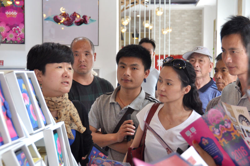 随后培训班学员来到开封七盛角商业区参观了文创品牌豫游记的形象展示店,带队老师李玲博士为大家详细讲解了这家创办仅三年的文创企业如何利用传统文化资源进行设计创新的历程,并且结合店内众多木版年画文创产品为大家做了详细的设计分析。经过中午短暂休息,学员一行到达木版年画诞生地朱仙镇,参观了久负盛名的木版年画一条街,并着重参观了朱仙镇木版年画代表人物张继中“万同老店”和尹国法“天成老店”,来自全省各地的木版年画艺人汇聚一堂,针对雕版、制版、印刷、装裱等诸多专业问题同朱仙镇年画艺人展开热烈的探讨。