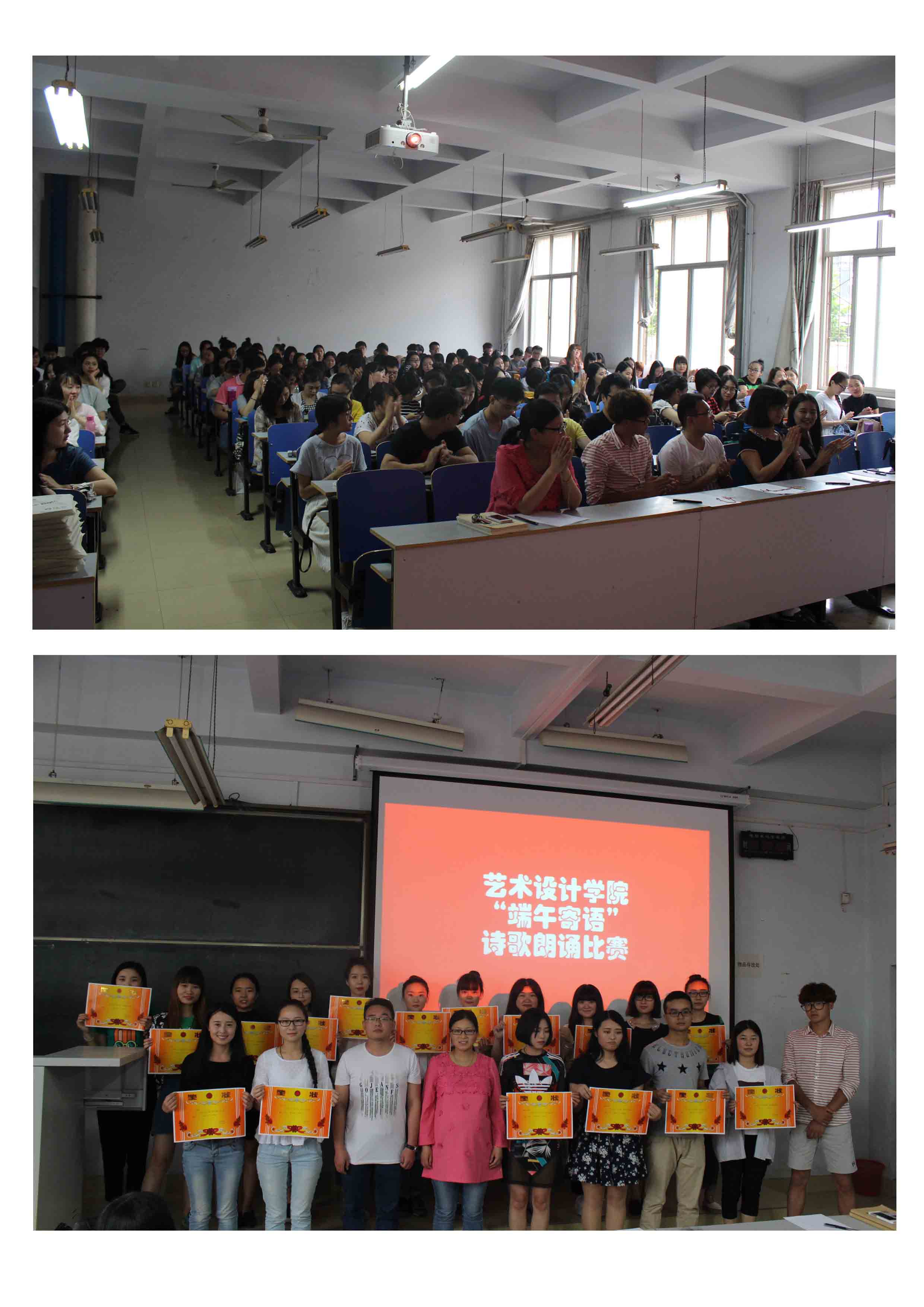 浓情端午,粽叶飘香,为了纪念流传了两千多年的民俗节日“端午节”,2016年6月2号下午,艺术设计学院在教三楼106教室举行了“端午寄语”诗歌朗诵大赛,研究生辅导员唐丹丹老师、校研究生会副主席杨向龙、学院本科学生会主席伊吉林、学院第一届研究生会主席任静、全体研一研二学生及本科生近150人参加了此次活动,本次活动的主持人是2014级研究生张巧靓同学。
