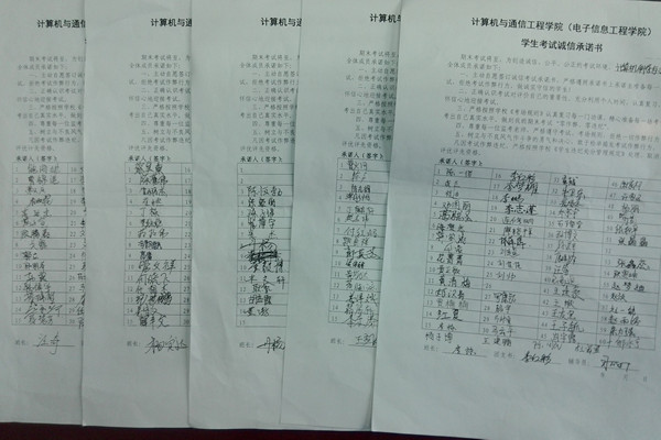 2016年6月15日-21日,学院各班级分别召开了“为人至诚 考试至信”的主题班会,辅导员进一步传达了学校的文件精神和学院的具体要求,使学生了解考试违规作弊的严重后果并引以为戒,增强自律意识,消除侥幸心理,引导学生诚信考试,诚实做人;主题班会后,各班级都签订了《计算机与通信工程学院学生诚信考试承诺书》。