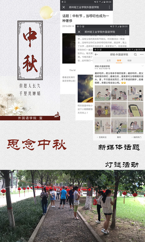 迎中秋、话民俗、品文化。2016级同学在人生的新起点,度过了一个美妙而又独特的中秋佳节。在活动中,同学充分展示了朝气蓬勃、奋发进取的精神风貌,昭示着他们将携手并肩在轻院这个大家庭书写新的篇章。