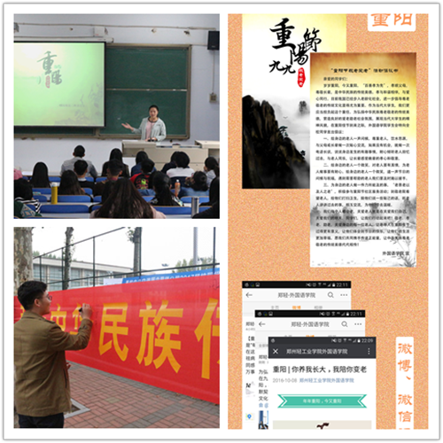 在重阳节到来之际,外国语学院学生会在全校范围发起尊老敬老倡议和广场签名活动,号召青年学生,给父母打个电话,给身边的老人一个微笑,为长辈做一件贴心的事,将敬老爱老行动落实到细微之处。在活动中,我院学生组织还通过官方微博、微信等形式宣传、介绍传统节日,发出“孝心微行动”的倡议和讨论,引起广大学生热议。