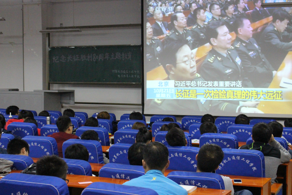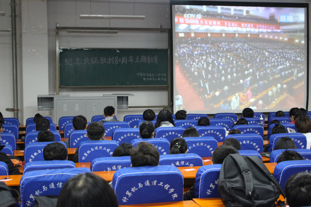 为纪念红军长征胜利80周年,进一步激发广大党员干部和青年学生的爱党、爱国、爱校热情。2016年10月20日上午10点,计算机与通信工程学院(电子信息工程学院)在计算机楼217组织观看了“纪念红军长征胜利80周年”大会纪念活动,学院分团委书记沈高峰、学工办主任司丽娜、全体辅导员、教师代表、学生班级班长、团支书、优秀团员代表、党员、发展对象及入党积极分子共300余人参加此次活动。