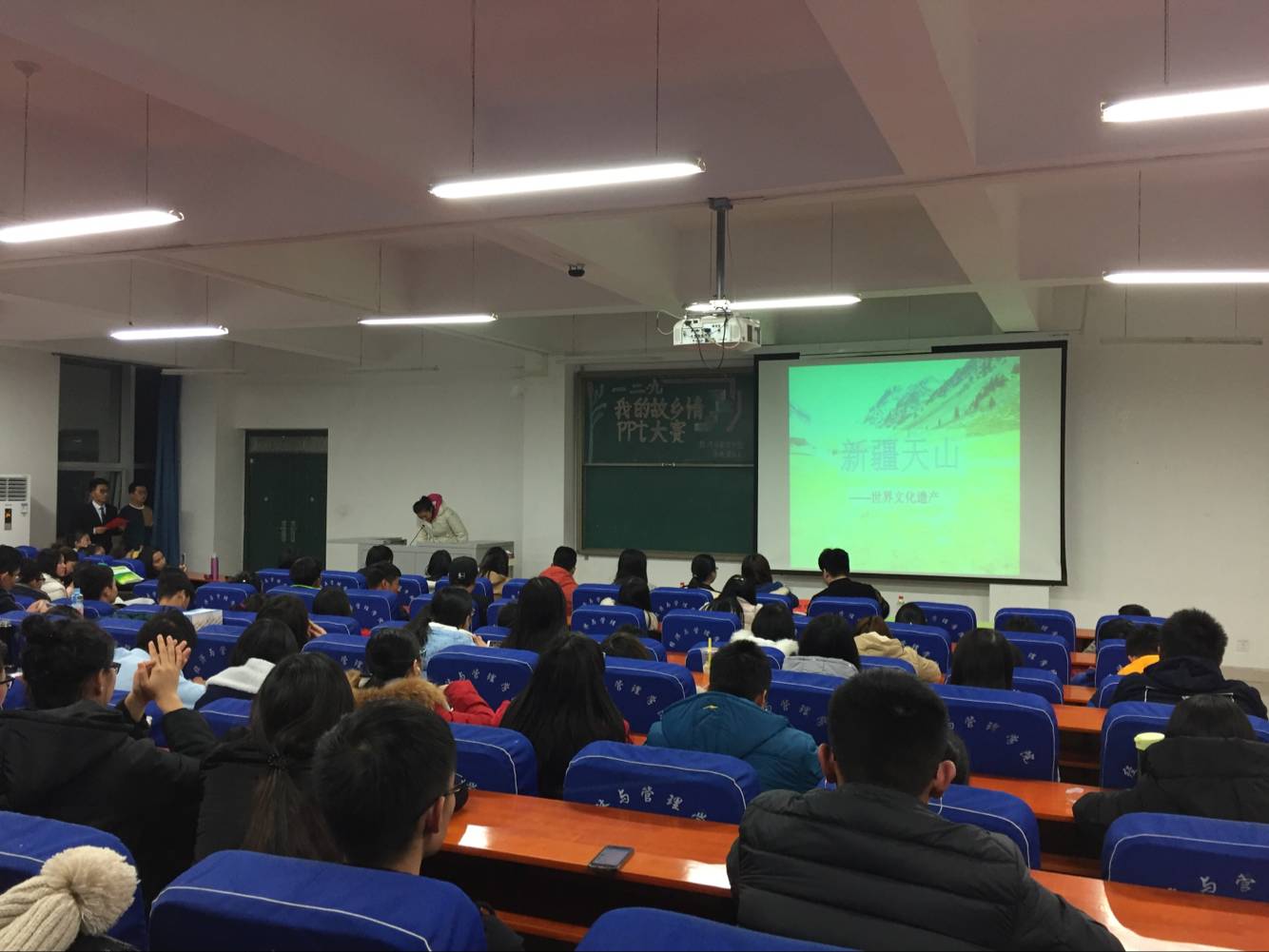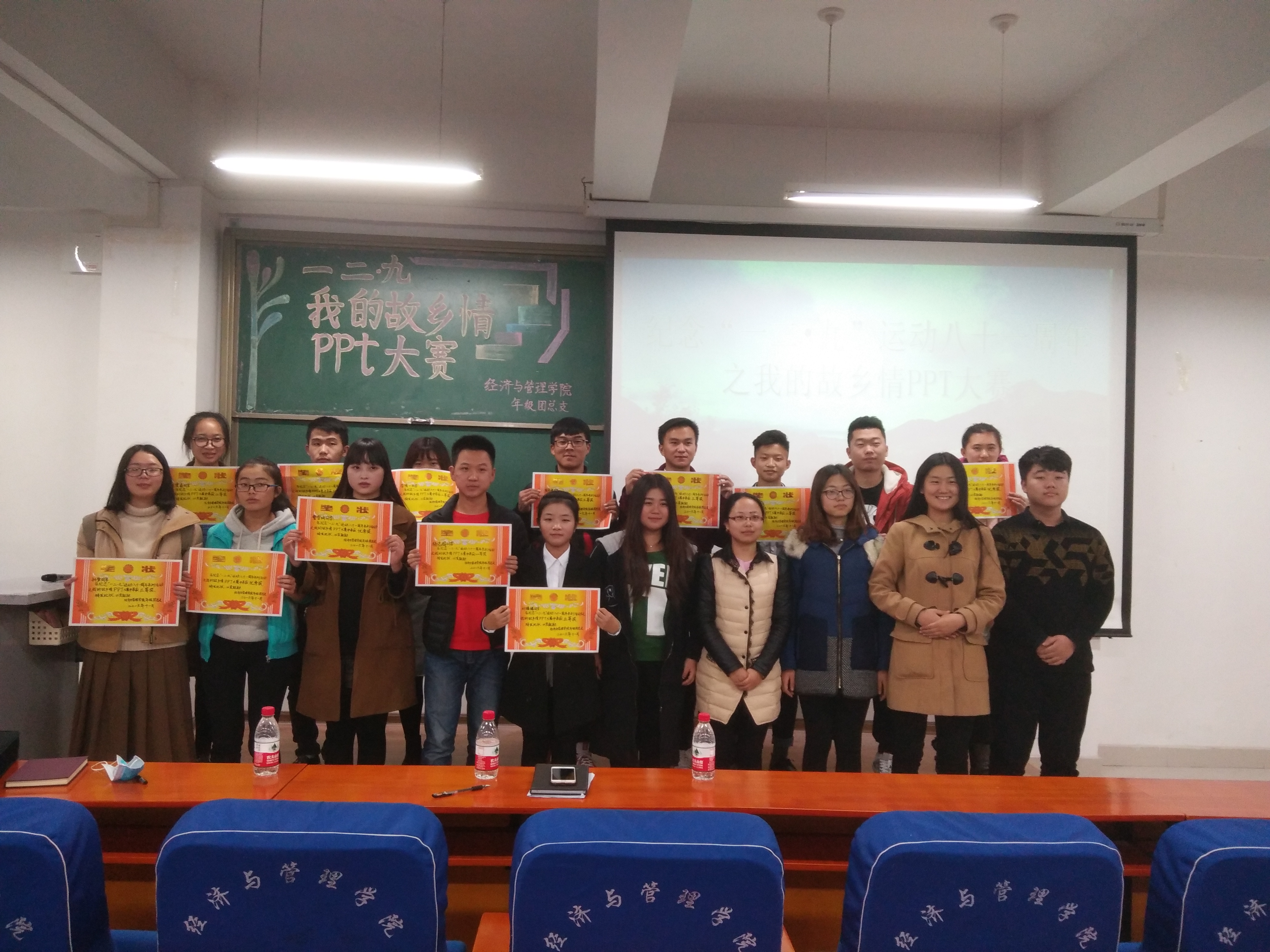 为纪念一二•九运动81周年,弘扬爱国主义精神,增强大学生的爱国之情、念乡之情,11月25日晚上19:00,经济与管理学院在经管楼211举办了纪念一二•九运动81周年系列活动之我的故乡情ppt大赛。此次活动由经济与管理学院分团委年级团总支承办,学工办副主任王静老师和16级各班学生代表参加了此次活动。