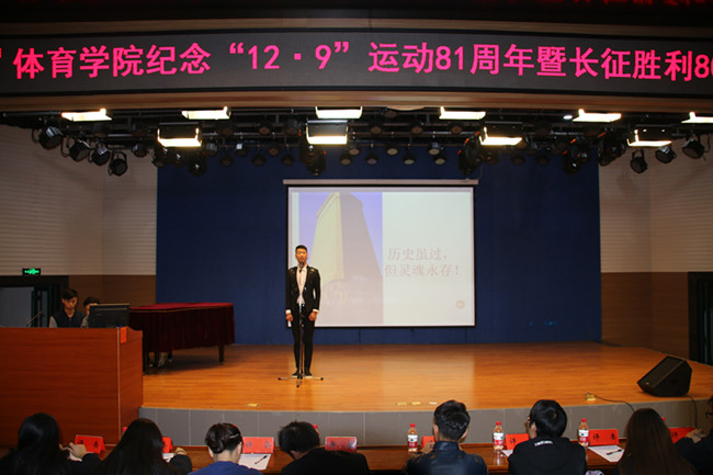 为了进一步加深同学们的爱国情感,铭记一二·九运动及长征历史,11月30日下午,体育学院在教一楼107举办纪念一二·九运动81周年暨长征胜利80周年主题演讲比赛。体育学院分团委书记、学工办主任以及全体学生到场观看了比赛。