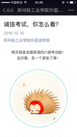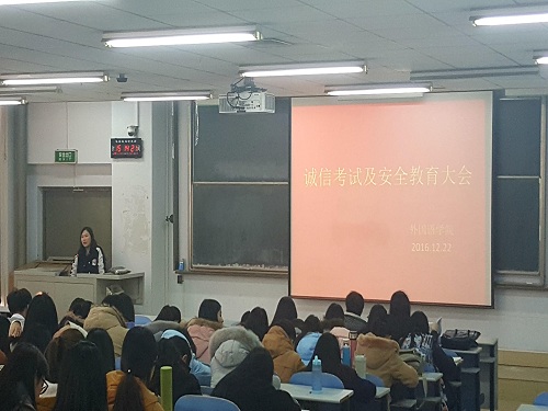 15日、22日,外国语学院分别在在教三楼104、204教室召开诚信考试教育动员大会,倡导诚信考试,做一名文明的大学生。在会上,辅导员老师们带领大家学习了《中华人民共和国刑法修正案(九)》(2015年11月1日施行)、《郑州轻工业学院学生违纪处分管理规定》和《郑州轻工业学院授予学士学位的暂行实施细则》(修订),宣传考试的权威性和严肃性。各年级辅导员还通过座谈会、QQ群、微信等形式,加强考风考纪教育,扩大宣传的覆盖面。