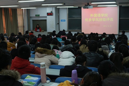 为加强学风建设,展示班级学风建设成果,12月30日,外国语学院在教三楼104教室举办优良学风班评选活动。学院全体辅导员及16级学生观看了展示汇报。