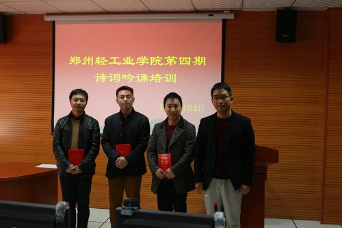 仪式上,外国语学院党总支书记、河南省吟诵学会秘书长杜红亮老师宣读了《关于聘任霍琨、林森、贺小帅、罗苏理同志为郑州轻工业学院吟诵社指导教师的决定》,并颁发了证书。河南省博物院华夏古乐团林森老师作为指导教师代表发言,介绍了乐团开展古乐器复制和传统音乐再现、展演的情况,表示将以吟诵培训活动为契机,进一步探索古典诗词吟诵的传承和教学推广工作。校团委书记葛勋老师对华夏古乐团四位老师加盟诗词吟诵社表示感谢,希望各位培训班学员珍惜机会,进一步提升吟诵水平,并祝愿华夏古乐团、河南省吟诵学会、郑州轻工业学院吟诵社合作愉快,走向共赢!