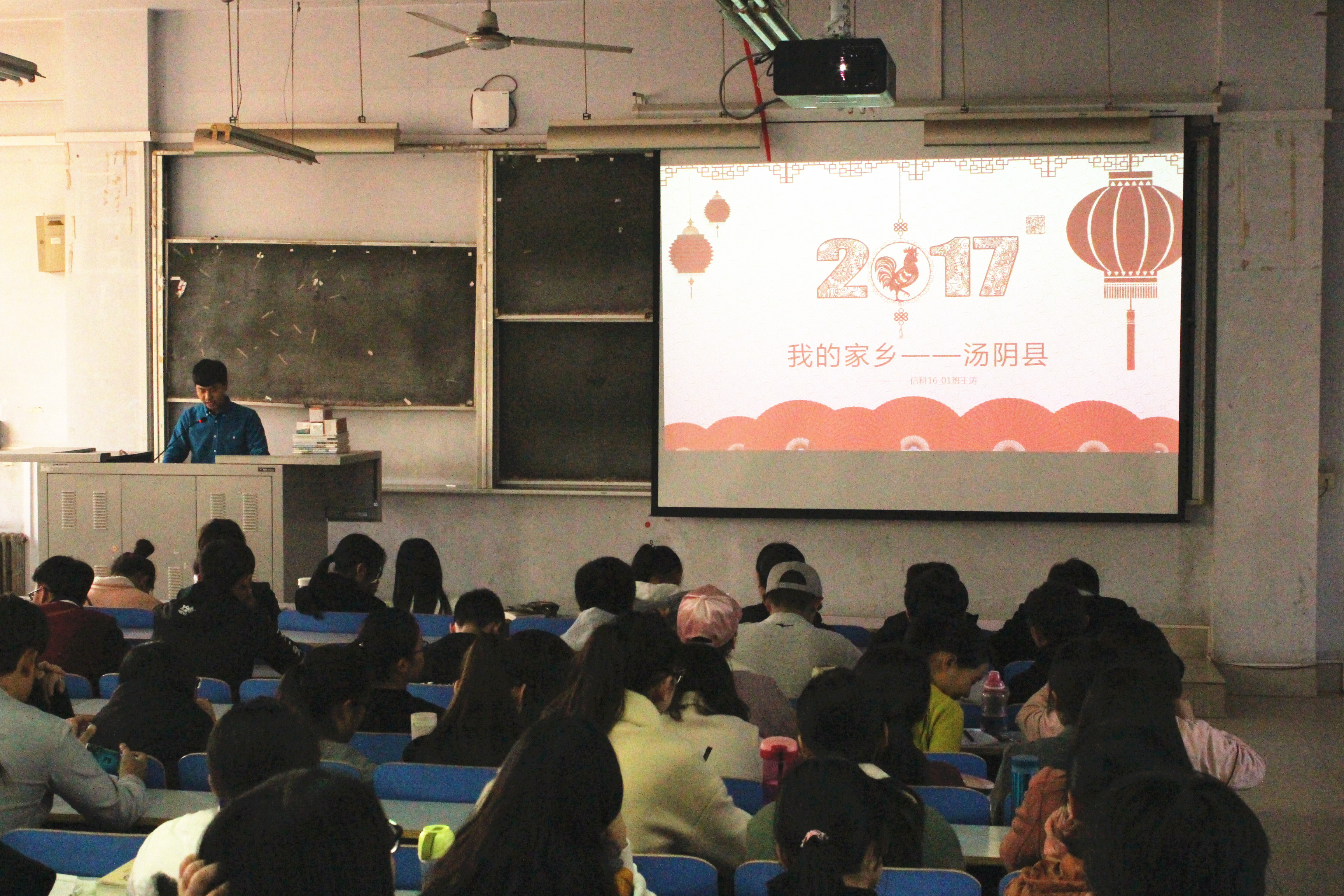 首先,由主办此次活动的社践部部长向大家说明活动的内容和过程,并阐明了本次活动的目的和意义。接下来,几位分别来自开封、汤阴、唐山等地的同学,一一向大家介绍了自己家乡的传统文化和民俗风情。他们利用文字、图片、视频等方式向大家展示了自己家乡独特的风俗习惯、美味特产、民族服饰及地理地貌等。通过他们几个的讲解,同学们对传统文化和各地的民俗风情有了一定的审视和了解,并深深地感受到了华夏五千年优秀传统文化的魅力。最后,又组织大家进行了“挑词连诗”的活动,同学们纷纷积极踊跃的参与。在活动中,频频有同学展现出惊艳的表现,也引得在场观众阵阵热烈的掌声。最后,本次活动在一片欢声笑语中结束。