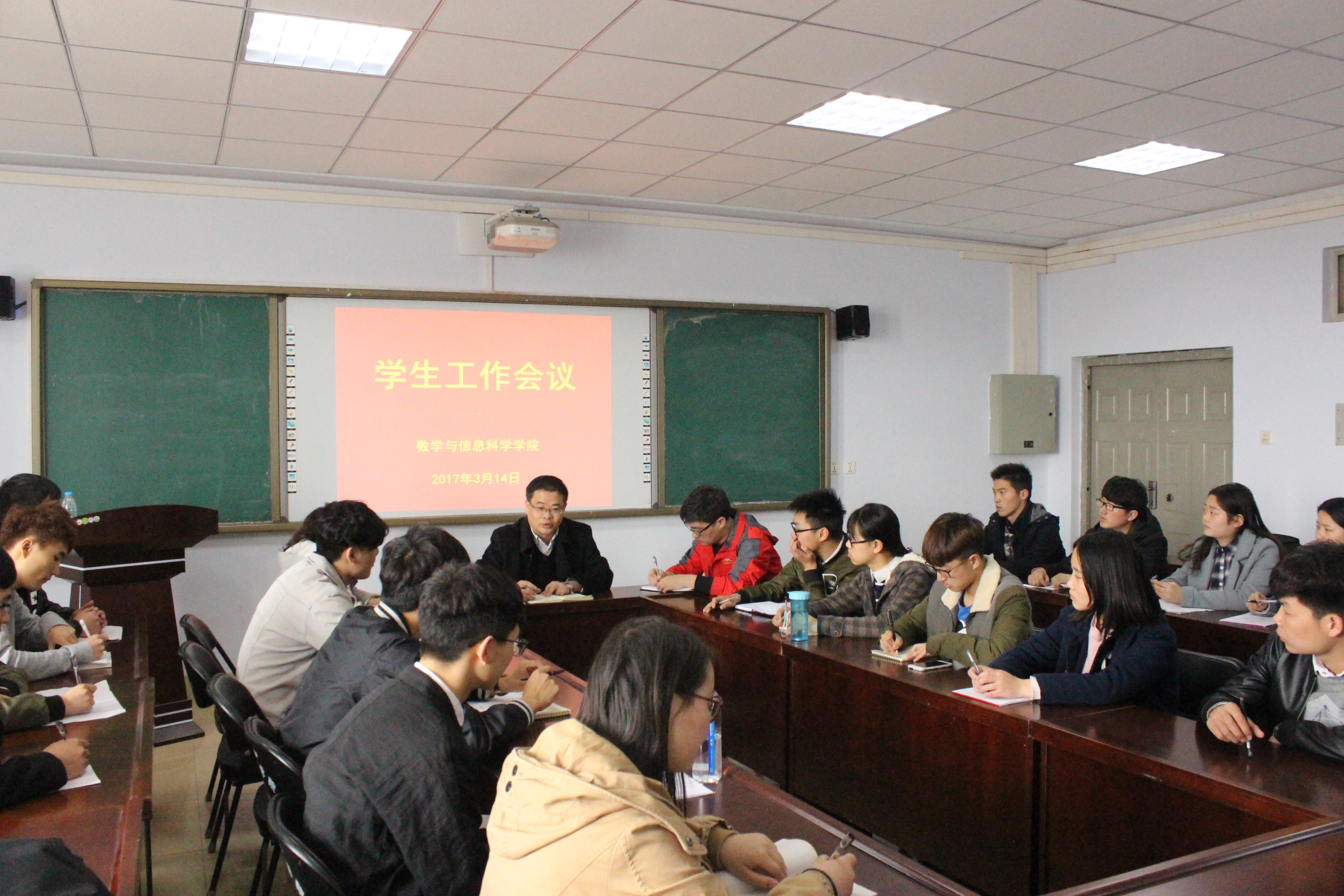 为加强学风建设、进一步了解学生思想动态,数学与信息科学学院于3月14日中午12:00,在教三楼1000室召开学院学生工作会议。院党总支副书记张阳老师、全体专兼职辅导员、主要学生会干部及各班班长团支书参加了本次会议。
