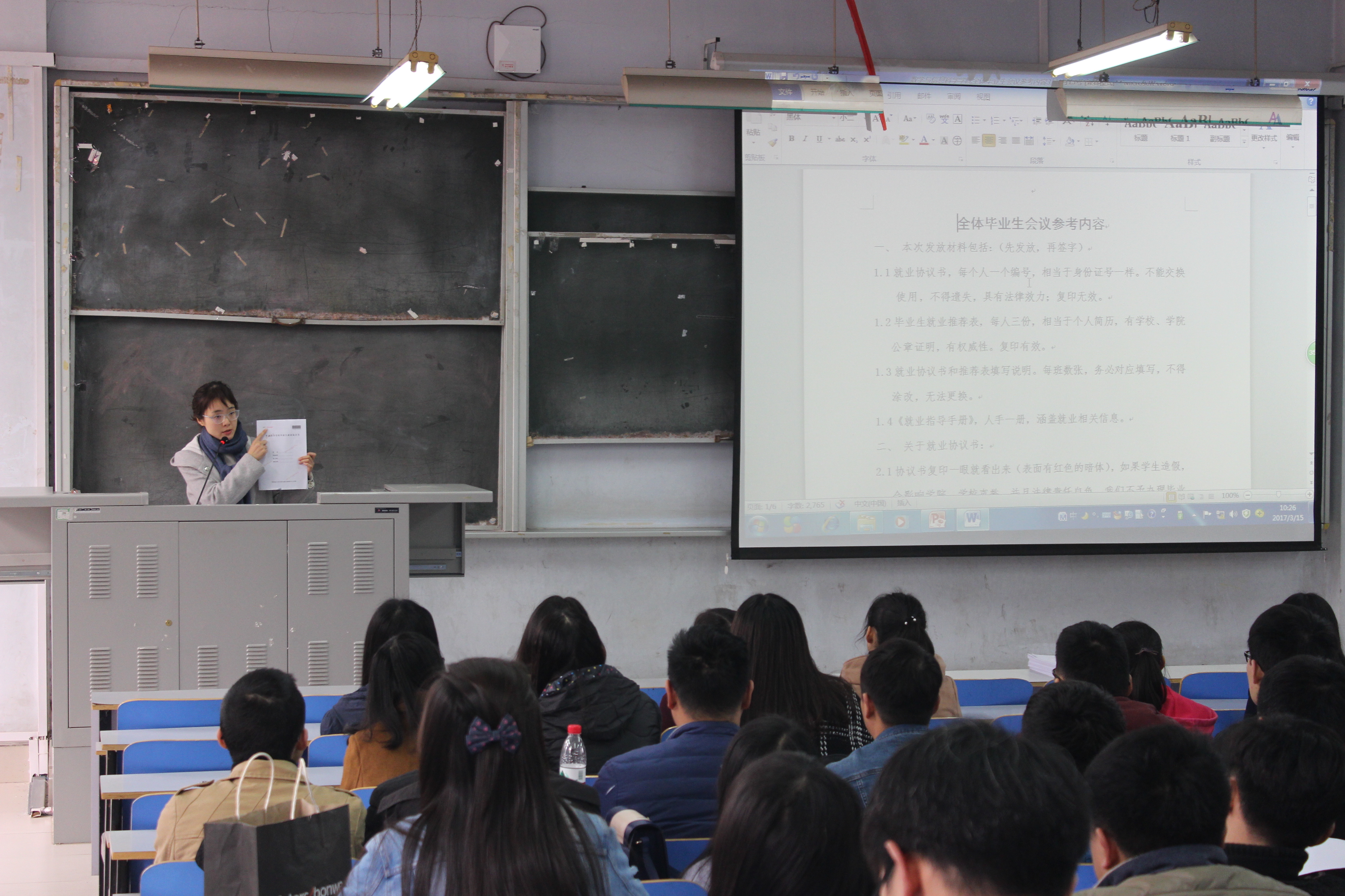 随后,张文卿老师对就业协议书、就业推荐表等材料的填写做了详细的说明。并结合实际例子介绍了签订就业协议过程中可能遇到的问题,以及相应的解决办法。并针对毕业生档案管理的新政策向同学们进行了详细的讲解。希望大家早日成功选择满意的单位。