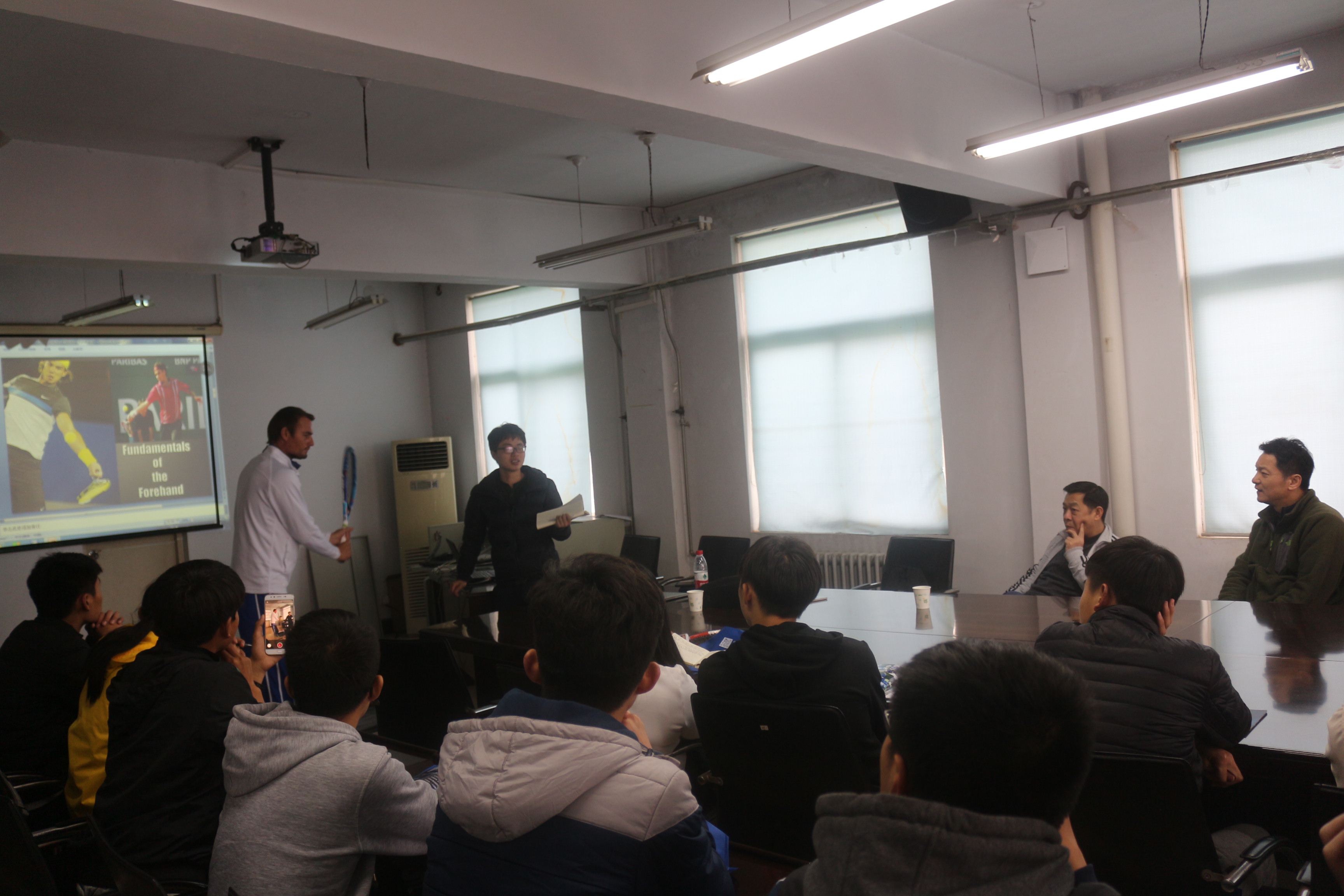 为了进一步提升我院体育教学训练学科水平,经我院与河南省网球协会协商,特邀请世界排名第一的美国IMG学院尼克波利泰尼网球学院主教练ARTEM STARKOV与美国迈阿密大学运动心理学博士匡许衡教授,于2017年3月22日上午在体育学院举办网球教学训练交流活动。期间ARTEM STARKOV介绍了美国IMG学院尼克网球学院最先进的网球教学训练方法,以及网球竞赛运动心理分析讲解,并与我院师生进行座谈等。体育学院院长李向东教授以及相关师生参加了交流活动。