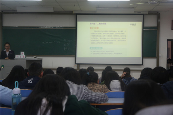 首先,中国光大银行代表张诗晨女士向同学们介绍了校园信贷的基本知识,并发放小册子,让同学们学习如何安全使用银行卡以及银行卡刷卡消费是否需输入密码等一系列知识;随后,张女士就校园信贷防范风险方面的知识进行了强调,点明“校园贷、网络贷、裸贷、电信诈骗”的危害,并提醒同学们要多了解并掌握金融安全防范措施,提高辨别金融诈骗能力,保护好个人信息安全。