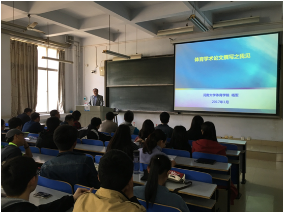 应我校体育学院邀请,河南大学体育学院党委书记杨军教授于4月13日下午3点,在东风校区教三楼107教室做了题为“体育学术论文撰写与国基金课题申报之我见”的学术报告。体育学院全体师生参加了本次学术报告会。