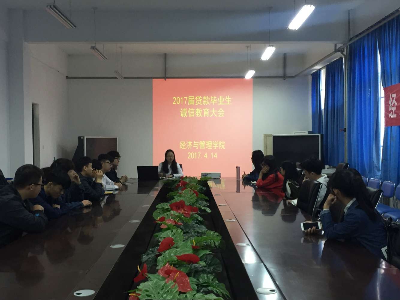 为强化学生诚信意识,进一步做好我院2017届毕业生贷款工作, 4月14日中午12点,经济与管理学院在科学校区经管楼116室召开“2017届贷款毕业生诚信教育大会”,负责贷款的陈思萌老师以及2017届贷款毕业生参加了此次大会。