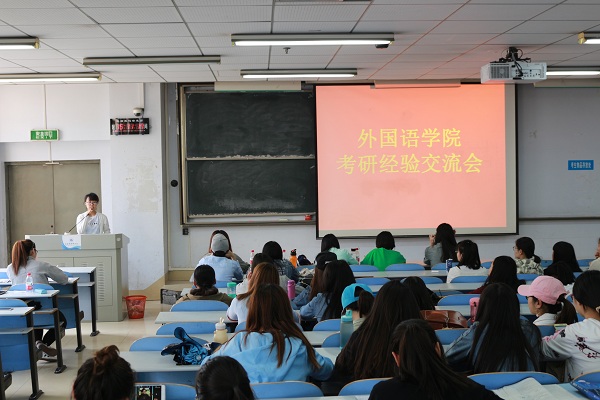 为使学生全面掌握考研信息、专业方向选择、制定考研相应复习计划, 2017年4月27日下午,外国语学院在教三楼104成功举办了“考研经验交流会”,会议邀请了2013级安艳红,张雪,董丹丹,闫亚宁同学针对复习方法、研究生类型和择校经验、专业介绍等进行介绍以及互动交流。