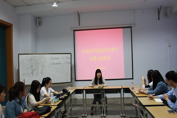 为贯彻落实我校《关于开展2017年“正学风 聚能量”学风建设活动的通知》精神,5月4日下午,外国语学院在东二楼409召开学业警示教育座谈会。学院学工办主任矫菲和学生会学习部成员、班级学习委员以及受警示学生参加了会议。
