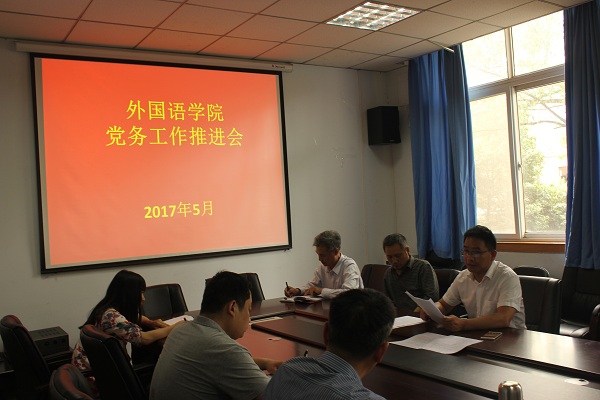 5月11日下午,外国语学院在东二楼306会议室召开党务工作推进会,传达了学校重点工作,分析学院的发展状况,并对学院党建思想政治工作进行了部署。学院总支委员、支部书记参加会议。